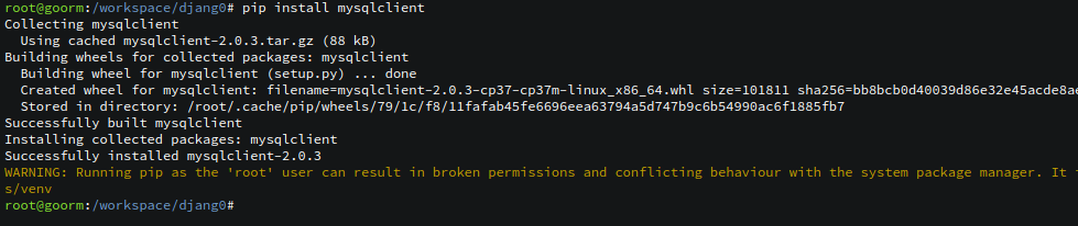 그리고 나서 pip install mysqlclient 를 실행하면 정상적으로 설치가 진행된다.